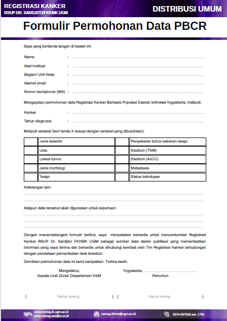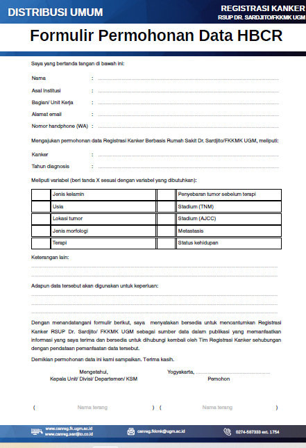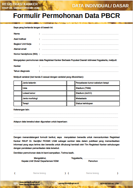 Adapun alur permohonan data adalah dengan mengisi formulir permohonan data yang kemudian dikirimkan ke email canreg.fkkmk@ugm.ac.id, disertai dengan dokumen pendukung berupa Ethical Clearance, Izin penelitian dari RSUP Dr. Sardjito, serta proposal penelitian.